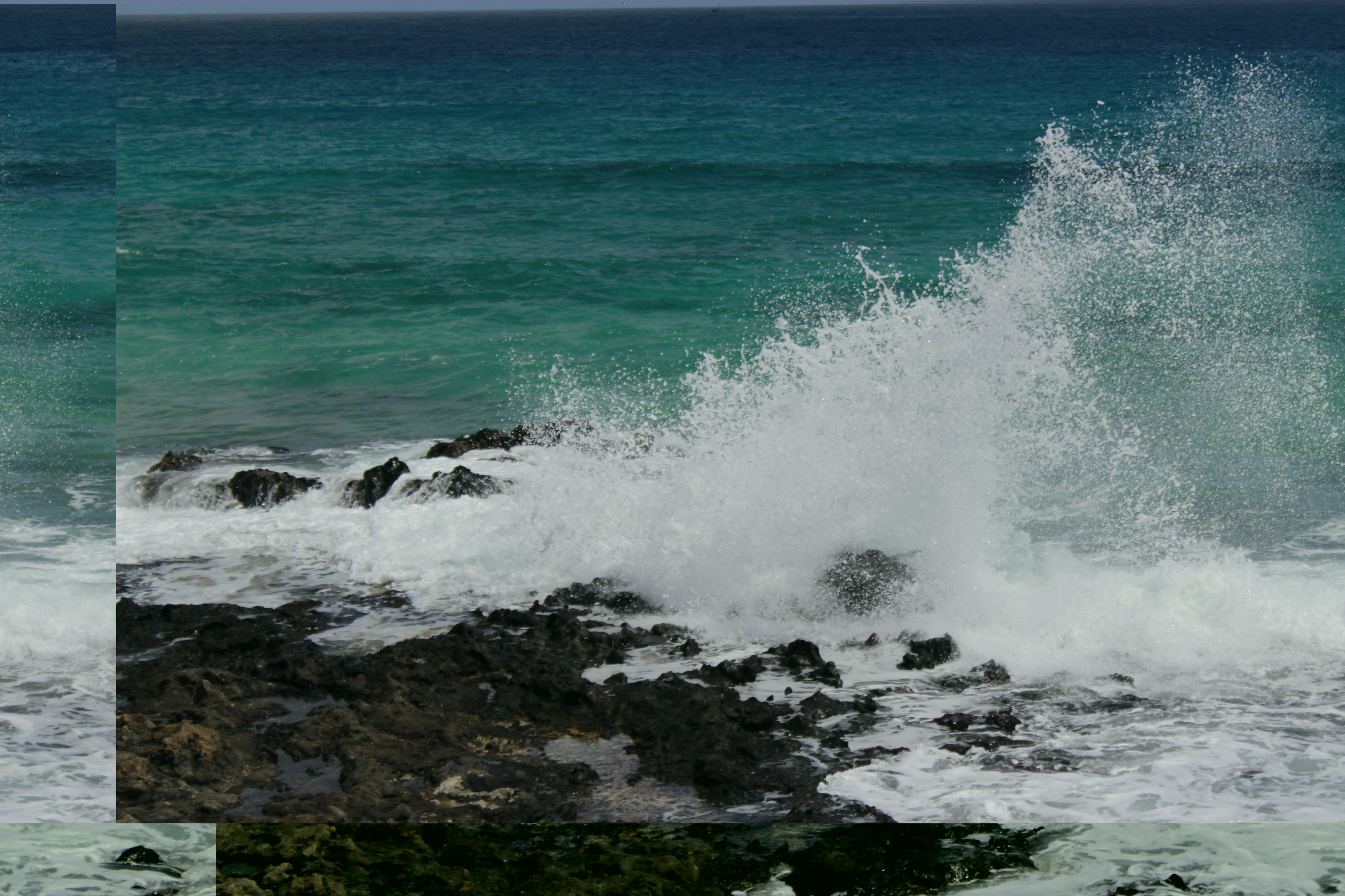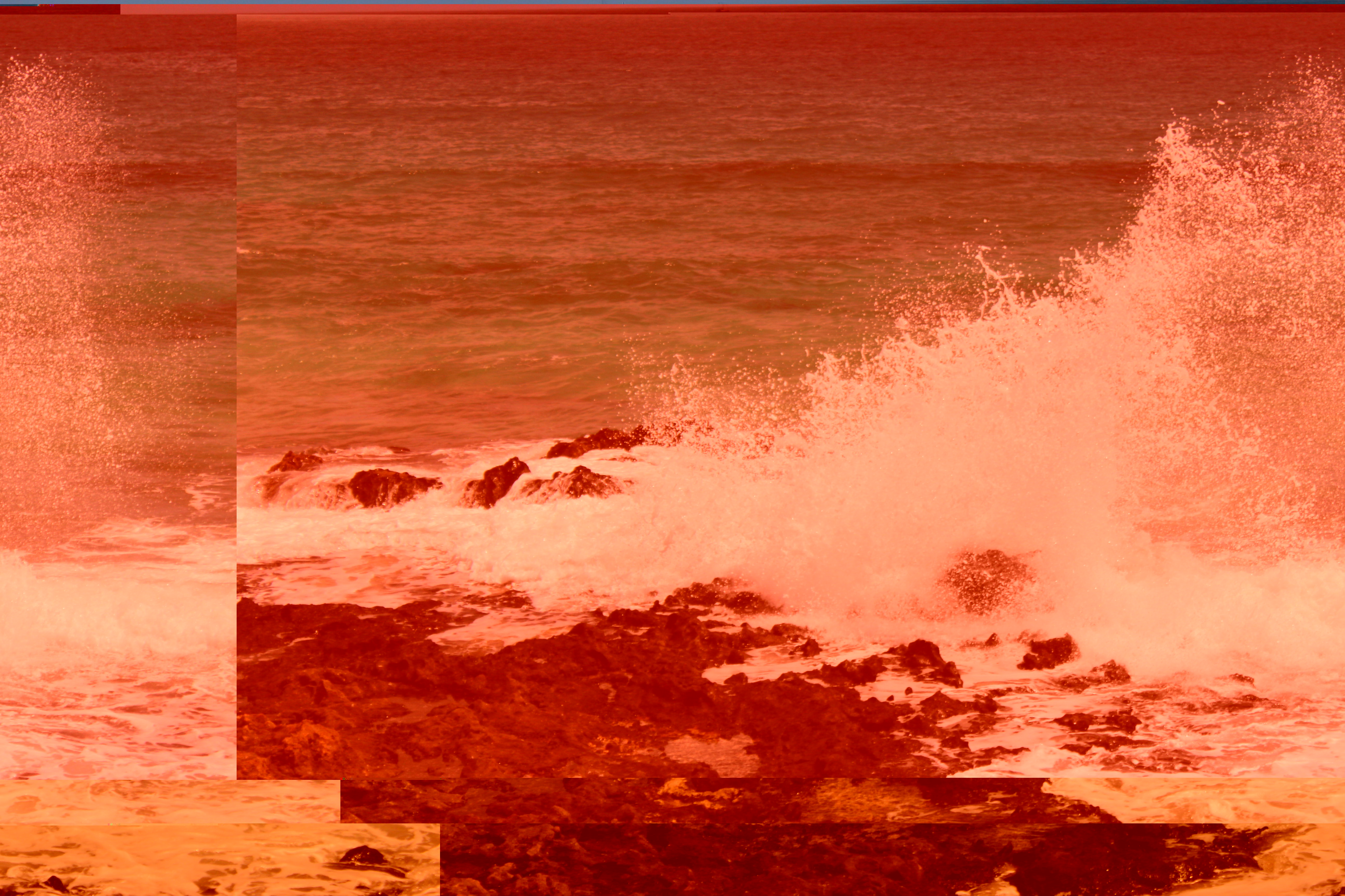 Creo que el resultado no es un glitch canónico, pero no deja de ser una imagen imposible: un mar rojizo, de lava, fuego o sangre, fragmentado, artificial y donde el color proviene de un puente rojo y oxidado que está en otra parte del mundo, un trozo de hierro fusionado con la naturaleza gracias a la modificación artificial de un fragmento de texto.